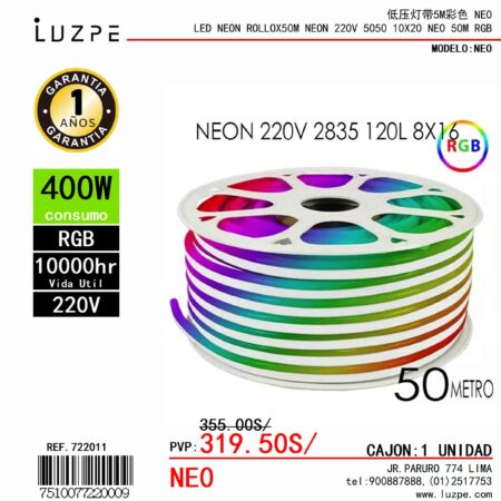 Cinta Neon RGB 50Mtrs de 220v